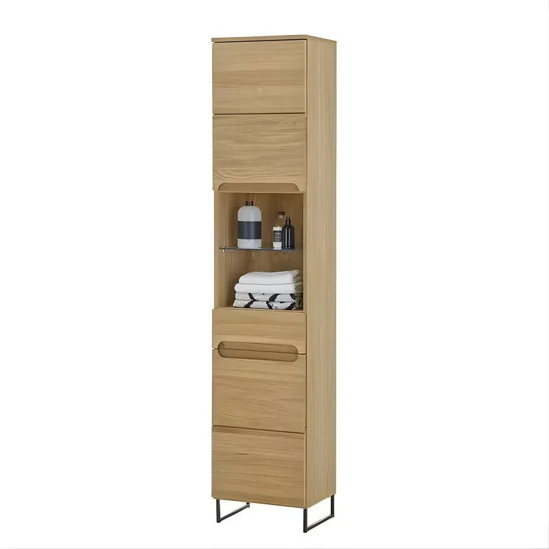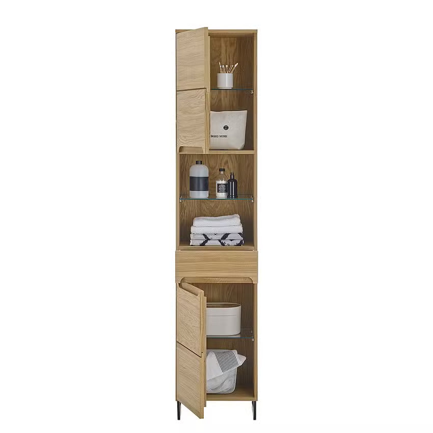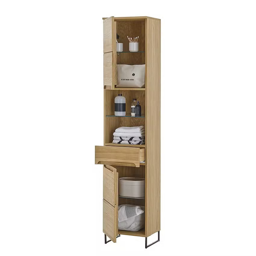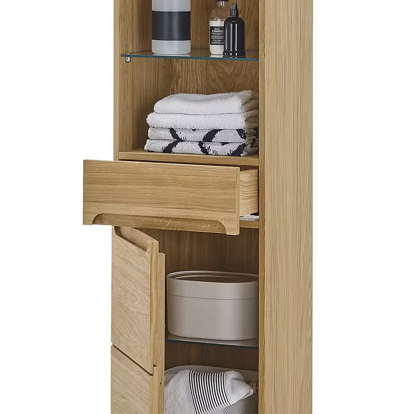 Transformez votre salle de bain en un havre de style et d'organisation avec notre Colonne de Salle de Bain en Chêne Massif. Mesurant 190 cm de hauteur, ce cabinet élégant allie beauté et fonctionnalité. Fabriqué en chêne massif haut de gamme, il offre une durabilité exceptionnelle et dégage une chaleur naturelle grâce à sa finition vernie. Les pieds en métal noir ajoutent une touche contemporaine qui s'harmonise parfaitement avec divers styles de décoration. Dotée de deux portes à fermeture douce et d'un tiroir, cette colonne révèle des compartiments spacieux avec trois étagères en verre et deux étagères fixes en bois, offrant ainsi une solution de rangement organisée. Facile à entretenir et partie intégrante de la série exclusive Euzio, cette pièce est conçue pour durer tout en apportant une élégance pratique à votre espace.