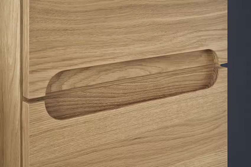 • Matériaux utilisés : Façades : Chêne massif (verni), Corps : Panneau de particules en contreplaqué, Pieds : Métal (noir)