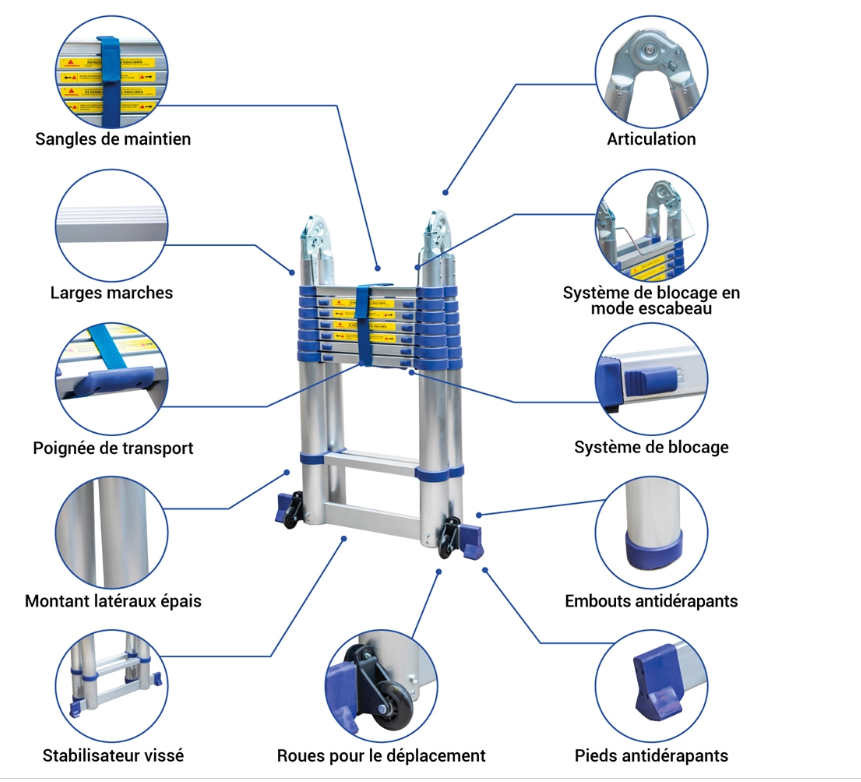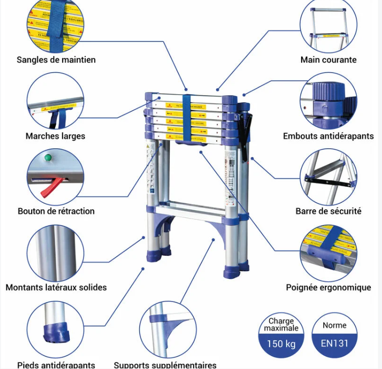 • Caractéristiques de sécurité : Pieds en caoutchouc antidérapants, mécanismes de verrouillage entre les marches