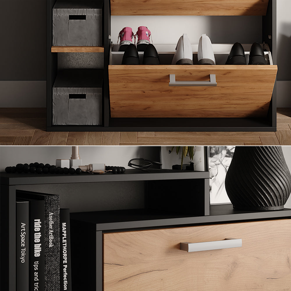 Fabriqué en panneaux de particules robustes avec un revêtement en résine mélaminée, il est non seulement durable mais aussi facile à entretenir. Le mélange élégant de chêne doré et d'anthracite s'harmonise parfaitement avec tout décor contemporain.