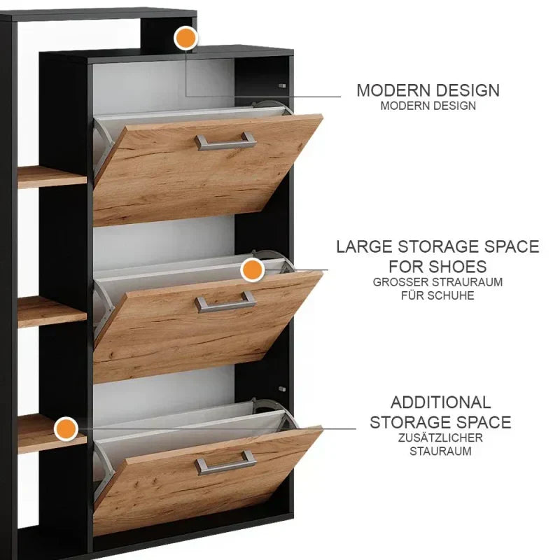 Découvrez le meuble à chaussures "Noir & Bois Clair 3 Compartiments", l'alliance parfaite entre style et fonctionnalité ! Avec ses dimensions compactes (80 cm L x 128,3 cm H x 24,2 cm P), ce meuble est idéal pour les petits espaces tout en offrant une grande capacité de rangement.