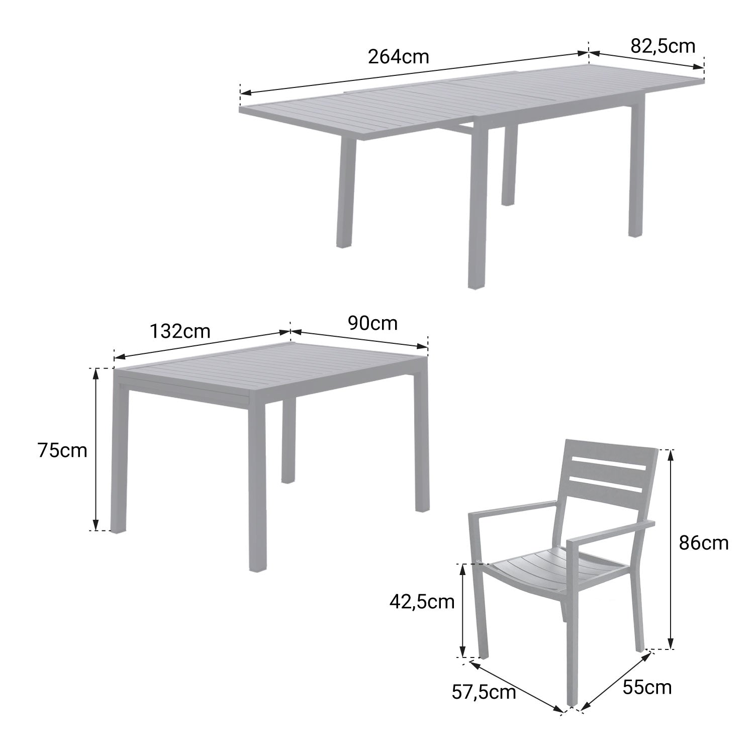 • Dimensions de la table : de 132 cm (compact) à 264 cm (étendue) de longueur