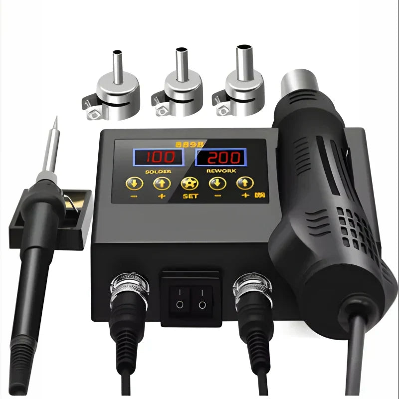 La Station de soudage 2 en 1 est l'outil ultime pour les professionnels et amateurs d'électronique, combinant un souffleur d'air chaud et un fer à souder électrique. Grâce à ses doubles écrans LCD numériques, son système intelligent d'auto-détection et sa fonction de refroidissement automatique, cette station garantit une précision inégalée et une sécurité optimale.